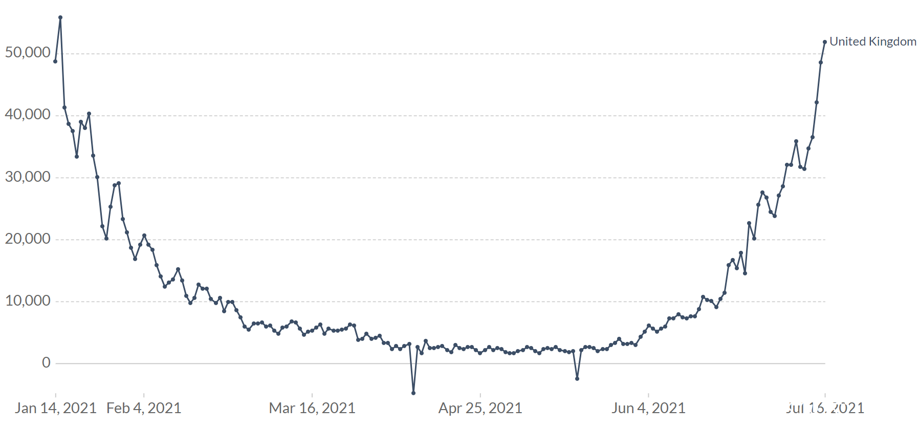 英國單日新增51,870例,超過5萬例,全球排名第二,僅次於印尼,創1月15日以來新高。