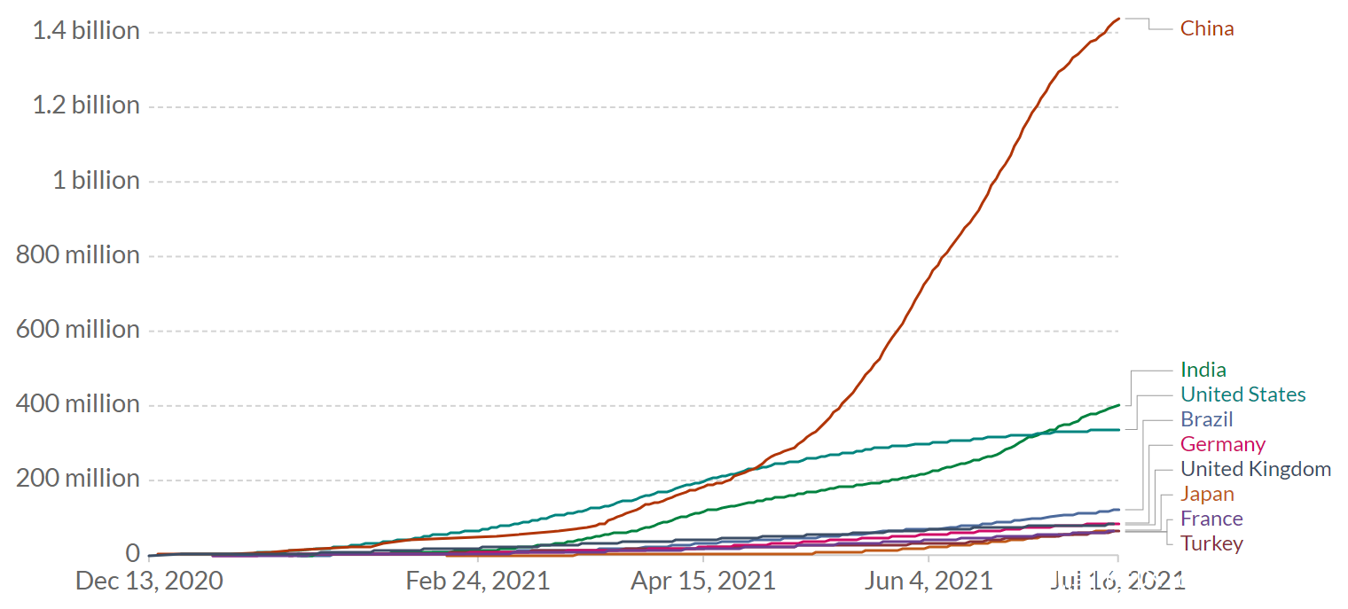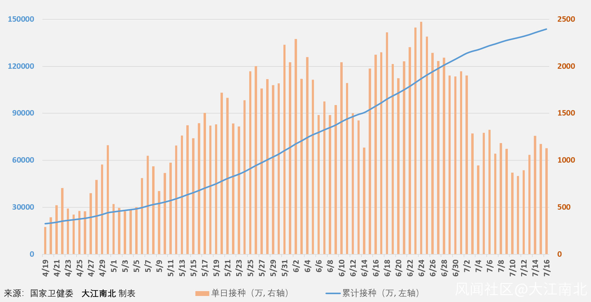 截止2021年7月16日,中國大陸累計接種新冠疫苗14.376億劑,繼續位居全球第一位,佔全球累計接種劑數的39.8%;其中單日新增接種1128萬劑,持續低位徘徊,佔全球單日接種劑數的37.7%。我國自3月23日以來,日均接種1170萬劑。**中國每百人累計接種101.83劑,環比增加0.80劑,是美國的1.012倍。後續隨着國產疫苗對少年兒童的接種工作全面開展,中國大陸在8****月份將完成建立全民免疫屏障(****70%**的人羣完成接種)的目標。