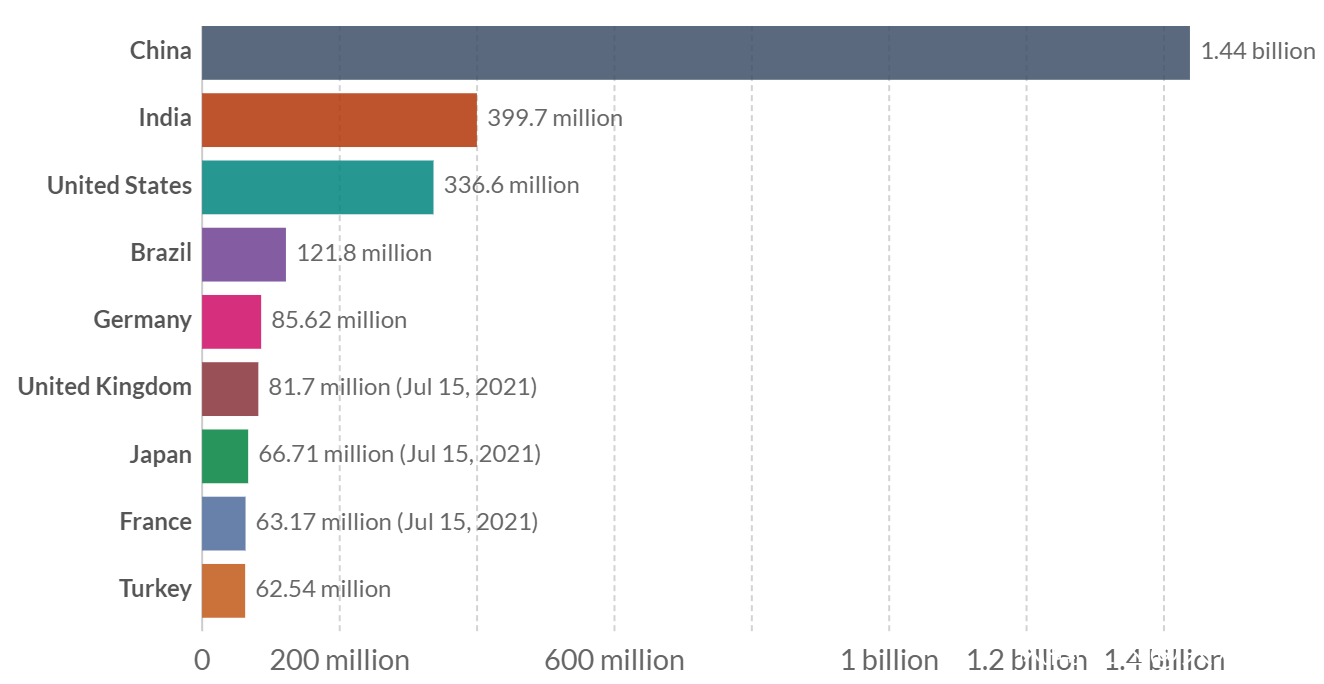 巴西、德國、英國、日本、法國、土耳其分列四到九位。英國的數據表明,疫苗不能完全阻止新冠病毒的傳播。