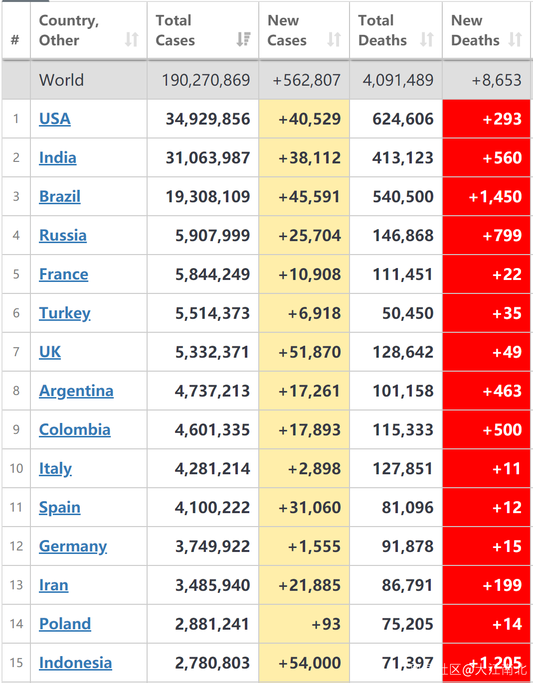 7月16日,**全球新增新冠確診562,807例;**累計確診1.9027億例;新增病亡8,653例;累計病亡409.15萬例。