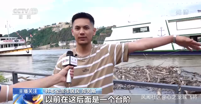 科布倫茨市居民 克勞斯:以前在這後面是一個台階,平時人們可以坐在這裏休息。現在因為水位高了,這片台階已經被淹沒了,現在已經不能在這裏坐了。