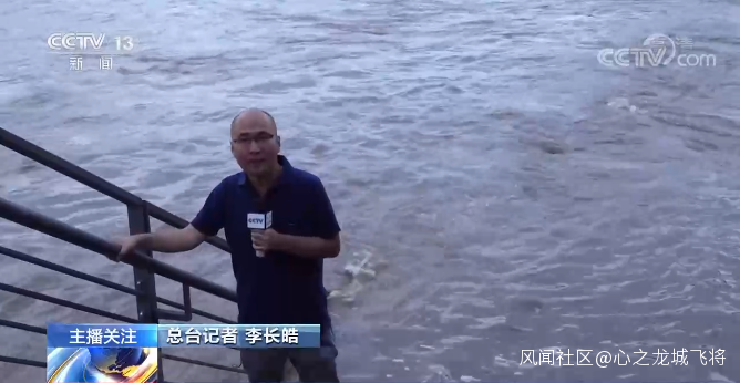 總枱記者 李長皓:從這個位置可以直觀地感受到洪水的威力,從上游傾瀉而下的洪水水流非常大,而且非常急。當地的民眾告訴我,我身後是一條他們平時休閒散步的休閒道,目前已經被洪水完全淹沒了。