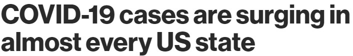 隨着Delta變種的傳播,美國每日新增病例,在短短一週的時間內猛增50%。全國幾乎所有州都出現了激增,即便是在加州、紐約州等疫苗接種率超過62%的州。