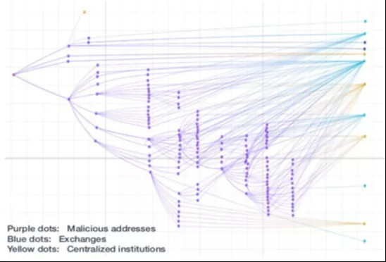 美國的交易所幾乎都是合法的,所以整個美國的交易所已經被收編了。下圖紫色部分是所謂的洗錢單位,黃色部分是中心化的組織,藍色部分是交易所。可以看出,每一筆交易到了好的交易所,還是到了一個洗錢的交易所,美國監管單位全都知道。2020年5月他們就發現有一些交易所100%洗錢,如果不小心把比特幣或者以太幣送到這種洗錢的交易所的話,就會被美國FBI或者美國國土安全局的人指控涉嫌洗錢。他們不一定會抓人,但這件事情就被記錄在案了。所以任何人想要洗錢,應該用現金,千萬不要用數字貨幣、比特幣、以太幣,因為用了數字貨幣後,數據都留在區塊鏈上,永遠不會被移除,總有一天會被公諸於世。