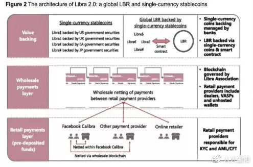 我一直推薦大家研究臉書穩定幣的項目,因為它是一個好的案例。下面是國際清算銀行在2020年4月畫的圖,它説明了臉書系統的貨幣是零售的,但它的鏈是批發的,它是零售貨幣和批發鏈的概念。