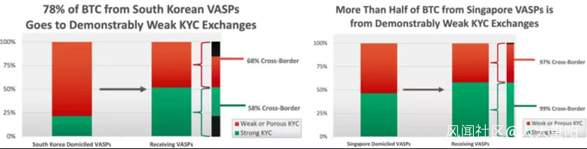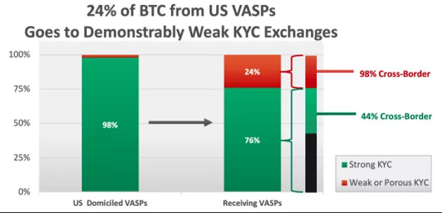 下圖綠色部分指的是比較安全的VASP,也就是數字資產交易商,大部分都到達一個比較安全的數字資產交易商,但有24%到達比較不安全的,這裏還分為44%跨境。可以看出,大部分洗錢都是跨境的,而且跨境這件事情都是紅色到紅色。