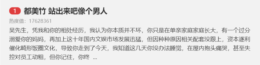 吳先生,憑我和你的相處經歷,我認為你本質並不壞,你只是在單親家庭家庭長大,有一個過分溺愛你的媽媽,再加上這十年國內文娛市場發展迅猛,但因種種原因相關配套沒跟上,資本逐利催化畸形飯圈文化,導致你走到了今天,我知道這幾天你沒辦法睡覺,在屋內抱頭痛哭,甚至失控對員工動粗,但你記住,你終究是個人,你更是個男人,你要長大,你要面對自己的責任,哪怕你去自首我都佩服你,但不管是傷害自己,還是傷害別人,都是不正確的,更不要逃避生命,想想你的媽媽,別管對錯,她的確為你付出了許多。