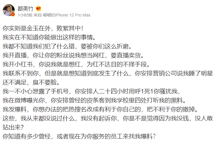 我一不小心泄露了手機號,你安排人二十四小時用呼1死1你騷擾我,我在微博曝光你,你安排曾經的皮條客到我學校裏四處打聽我的黑料。
