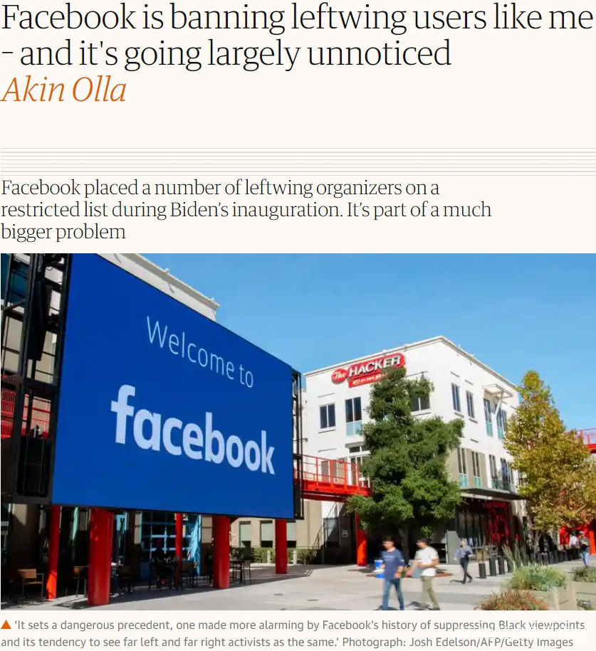 《衞報》:為了應對美國國會大廈的法西斯騷亂,Facebook 發起了一連串危險且被誤導的企業威權主義。我和其他一些左翼組織者被視為對喬拜登就職典禮的威脅,並被列入限制名單,限制了我與他人交流的能力。我的帳户無法再創建 Facebook 羣組或活動,這是我在過去十年中用來協調抗議和建立整個組織的兩種工具。我還被禁止在 Facebook 羣組中發表評論、點贊 Facebook 頁面以及向 Facebook 頁面發送消息。該限制將在就職典禮後的星期六取消,但在公眾強烈反對後才完全停止。這是 Facebook 將左翼活動家視為極右翼極端分子的悠久歷史的一部分,也是一種讓那些大聲疾呼反對種族主義和法西斯主義的人閉嘴的模式。