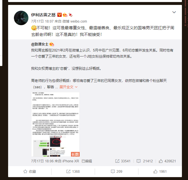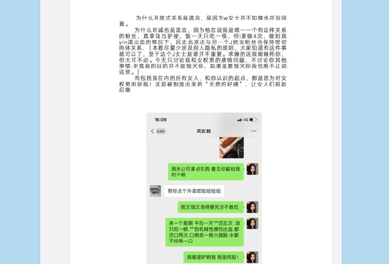昨天,一位叫@致譚女士的博主,發出了萬字長文,表示大V@周玄毅劈腿、出軌,還同時和多個年輕女孩同時保持關係。