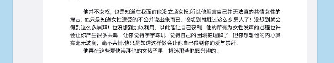 正如爆料帖中周玄毅自己説的,他不認為自己能理解女性的苦難,他只是轉發女性的困境,或者把女性的困境講出來而已:
