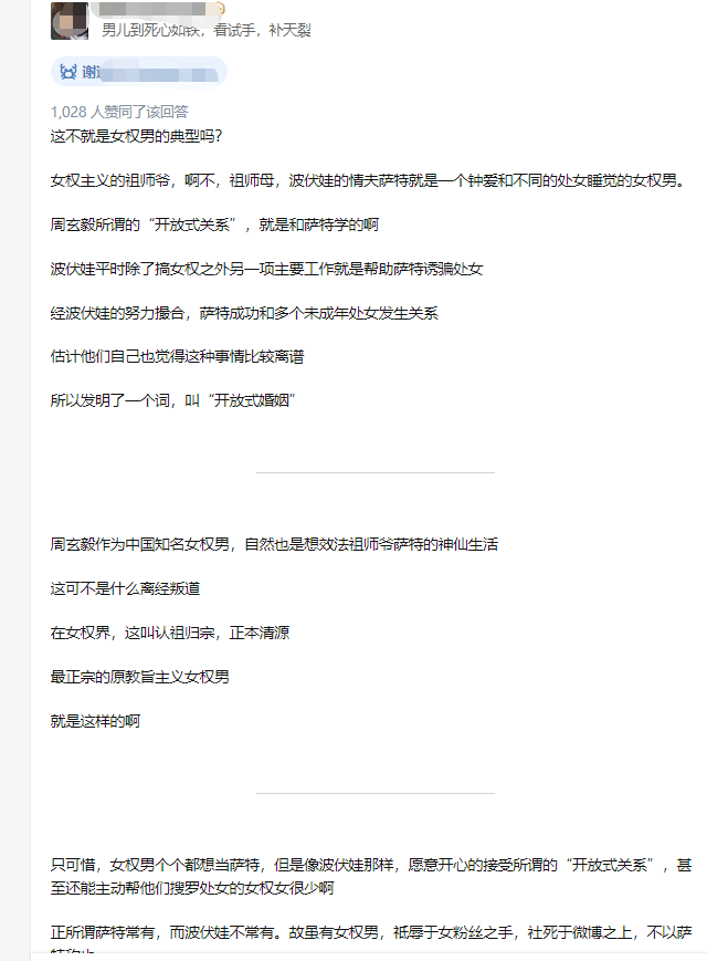 沒有任何一個博主可以代表“女權”,即使是“薩特”和“波伏娃”也不行。我們現在討論的女權,本質還是源於男女不平等,本質還是渴望平權。而無論你多麼反對某些女權博主,多麼反對周玄毅、伯爵們,都應該承認,現在我國乃至於全世界任何一個國家,在性別平等上還有不少可以改進的地方。