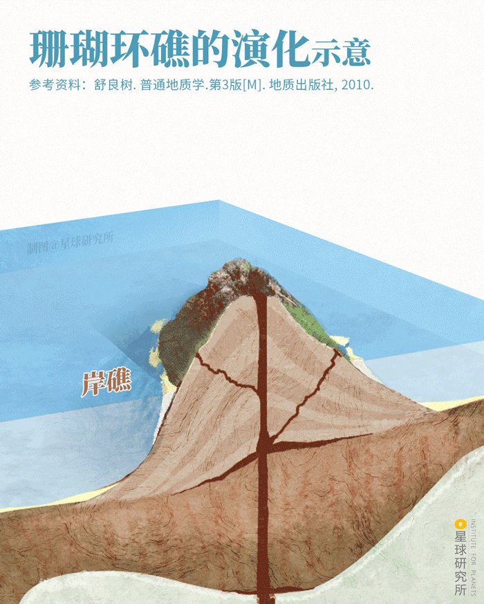 (珊瑚環礁的演化示意圖,製圖@鄭伯容/星球研究所)