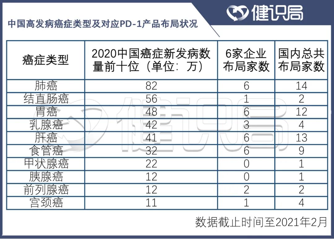 肝癌也是必爭之地。8款上市PD-1類品種中,有4款涉及肝癌。胃癌和食管癌競爭狀況稍好。其他如乳腺癌、前列腺癌、宮頸癌等,也有大量的競品。