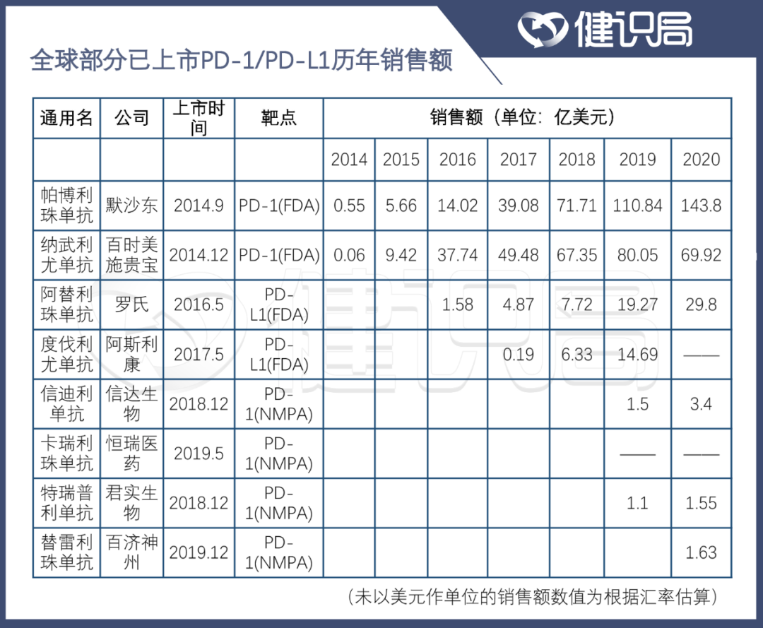 2014年7月,百時美施貴寶的O藥在日本上市,成為全球首個獲批的PD-1產品。5年後,其銷售額達到80.05億美元的巔峯。緊隨其後的默沙東K藥成為全球第二款獲批的PD-1產品,2018年,其銷售額於2018年首次超越O藥,並在2020年取得高達143.8億美元的業績。