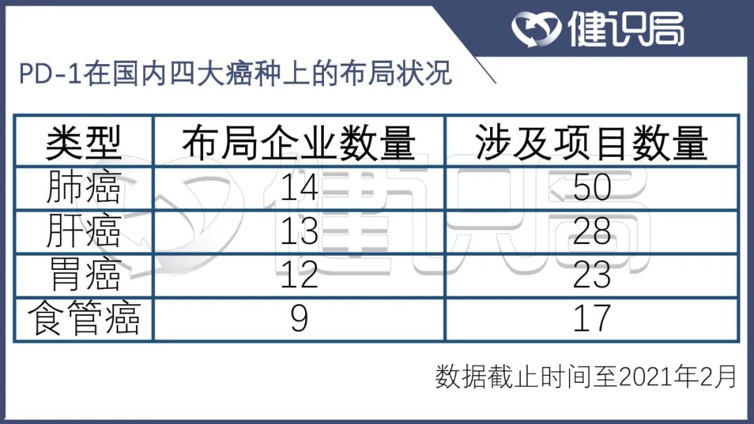 至此,從黑色素瘤、腎癌等小癌種,到非小細胞肺癌、肝癌等大癌種,現有PD-1類藥物幾乎已經實現了全覆蓋。