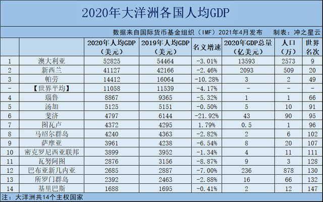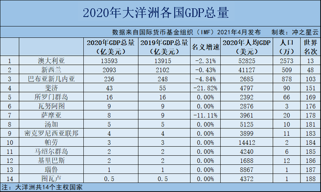 要是算GDP總量那就更明顯,2020年澳洲GDP佔全洲的84.9%,新西蘭佔13.1%,其餘12國合計才佔2%。