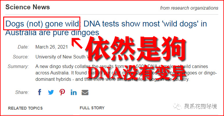 不過這個依據沒能持續到兩年,就又被“專業科學媒體”打假了。2021年3月,澳洲當地權威媒體Sciece News刊文説:DNA檢測的結果是,這些生活在野外的狗,從基因分析來看還是狗狗……