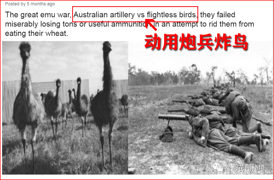 那是1932年的11月,當歐亞大陸戰爭策源地各國緊鑼密鼓地籌備着未來的大戰時,澳洲政府似乎是閒的Damn疼,竟然向澳洲西部荒原上的土著大鳥鴯鶓宣戰!當時澳洲政府派出了炮兵隊和機槍連……浩浩蕩蕩去西部剿滅鴯鶓(一種不會飛更沒有攻擊性的鳥)