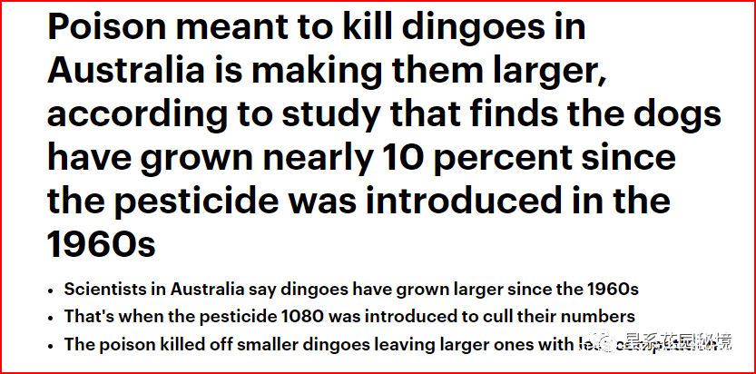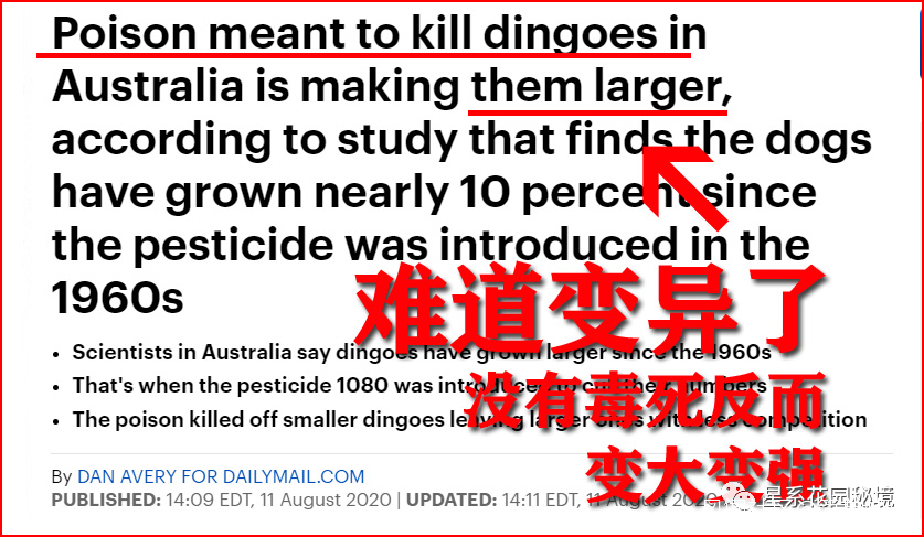 更搞笑的一個梗,便是為了徹底正義化和正常化殺狗,澳大利亞“專家”和媒體試圖反覆論證一個問題:那些吃了人類投放的大量毒藥卻沒死的狗,是不是“變異”啦?但專家們可以拿出的唯一證據只是野狗比家犬的體格平均大了10%……結果這個調查結果依然成為了殺狗的“理論依據”…