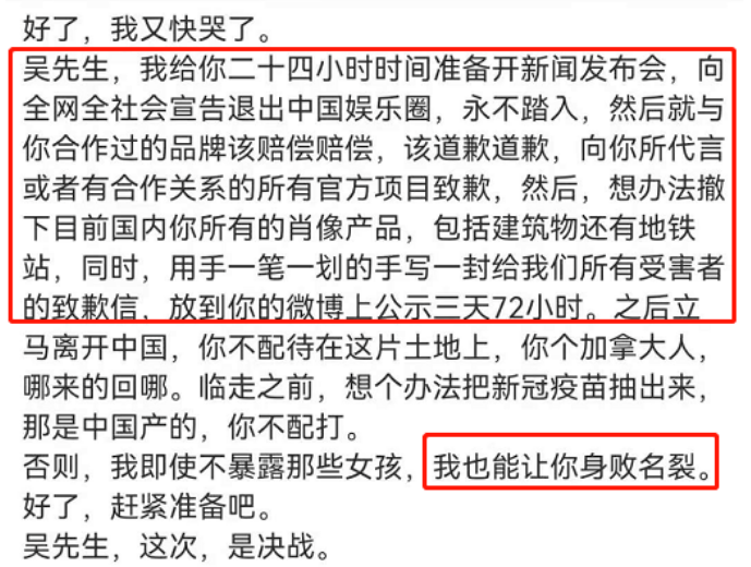 她要求吳亦凡開發佈會宣告退出娛樂圈,同時向合作品牌道歉賠償,撤下所有廣告,還要給眾多受害者致歉,並滾出中國。