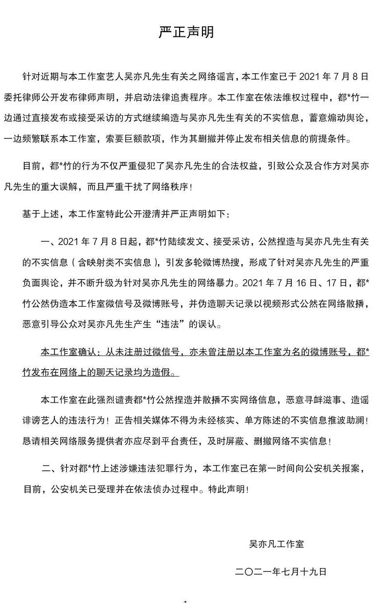 隨後吳亦凡工作室發文,稱已啓動法律追責程序並完成報案工作。