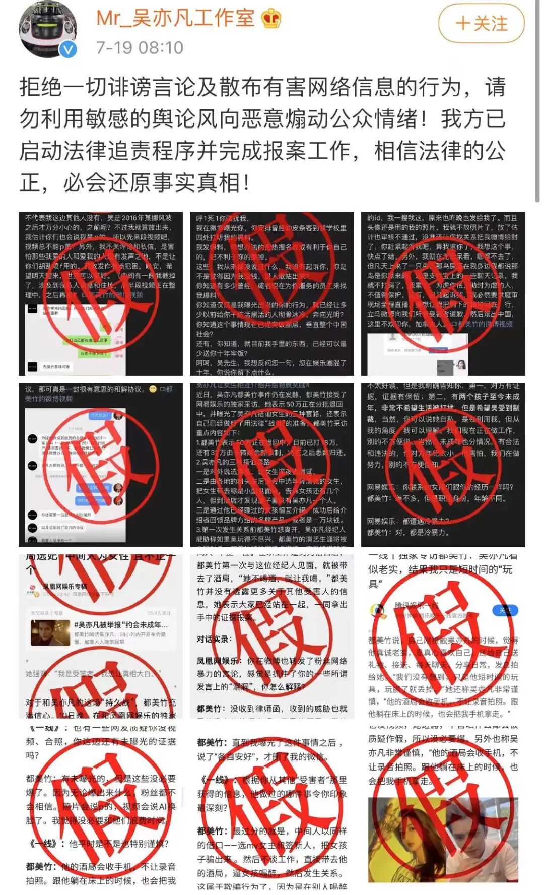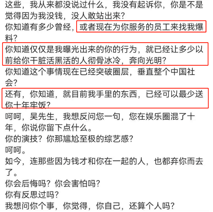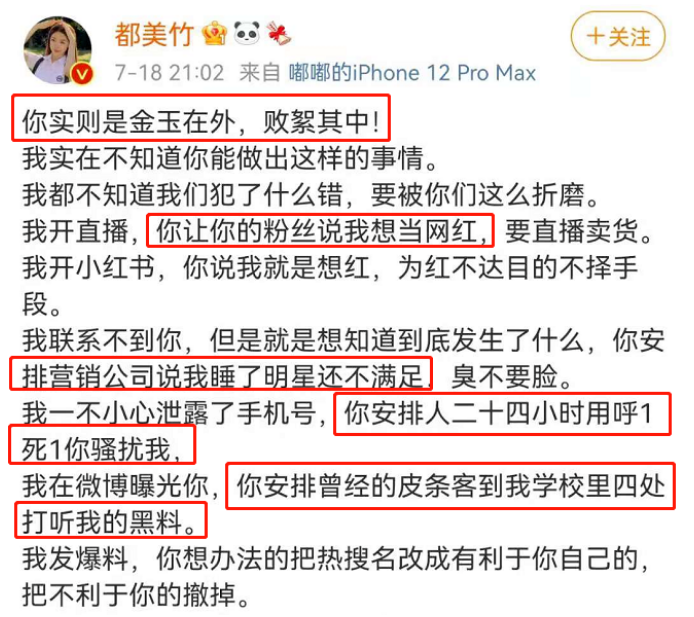 晚9點,都姐發文,稱吳亦凡在背後搞了很多小動作,包括營銷號放黑料、24小時呼叫騷擾、甚至安排皮條客打聽黑料…