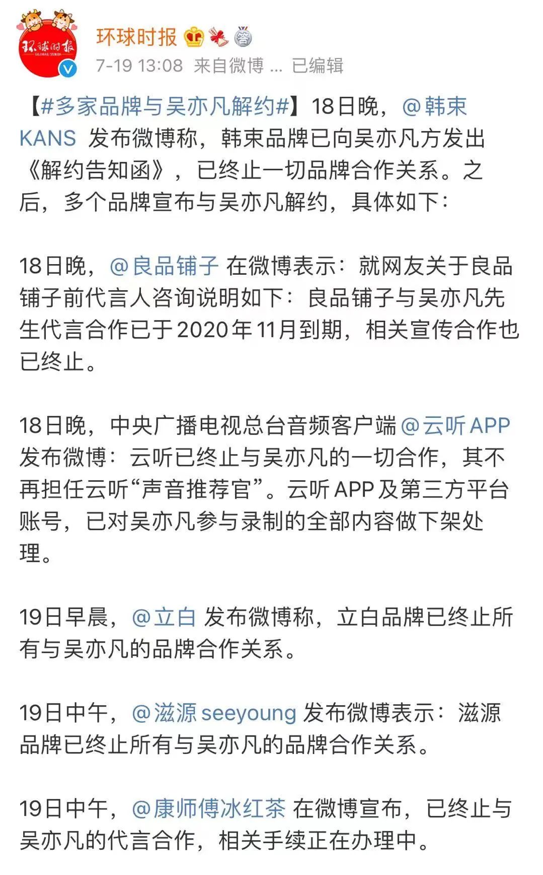 截止目前,王者榮耀、得寶、康師傅冰紅茶、華帝、雲聽app、韓束、滋源、立白,紛紛發聲明宣佈與吳亦凡合作結束。