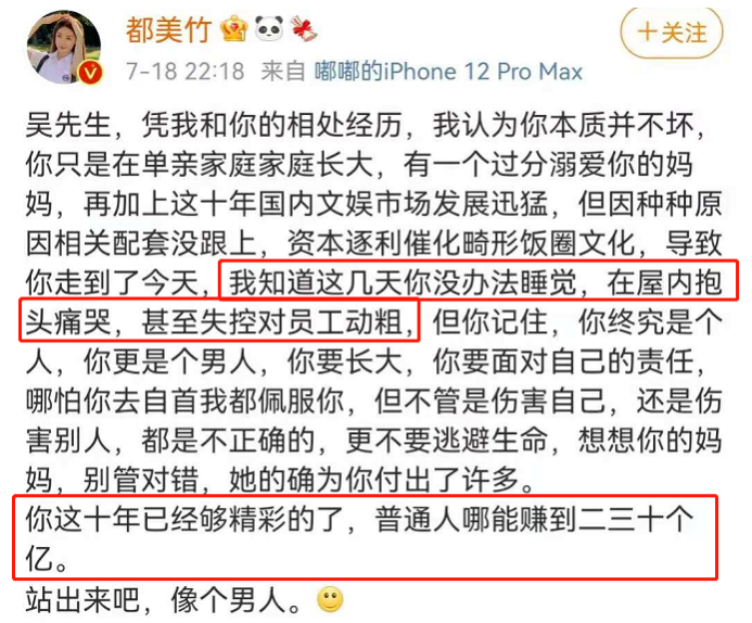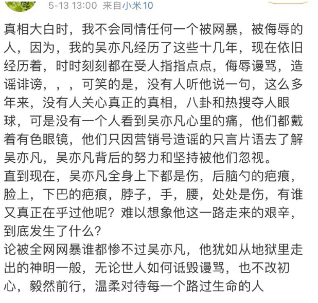昨晚10點,又發文稱吳亦凡被母親寵大了,不像個男人。這10年賺了二三十億也該到頭了,要求他站出來。