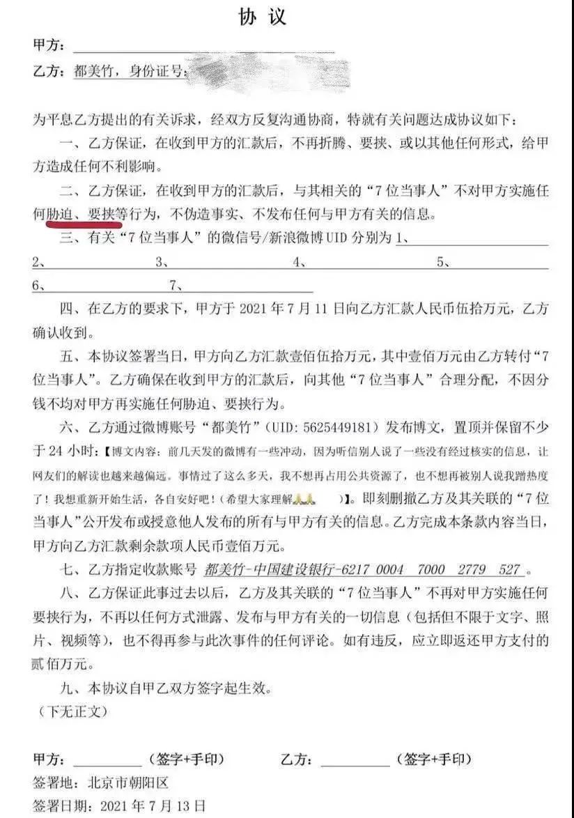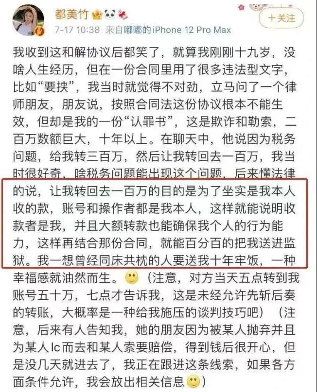 都美竹去諮詢了一下律師,才得知真的簽署了協議,後續會因敲詐勒索,吃十年牢飯。好傢伙,這狠心程度媲美吳秀波了。
