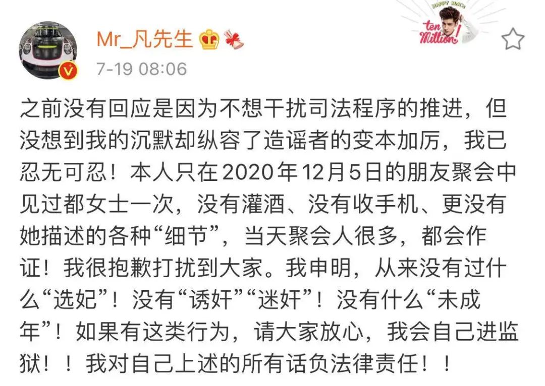 “從來沒有過什麼‘選妃’!沒有‘誘姦’‘迷姦’!沒有什麼‘未成年’!如果有這類行為,請大家放心,我會自己進監獄!”