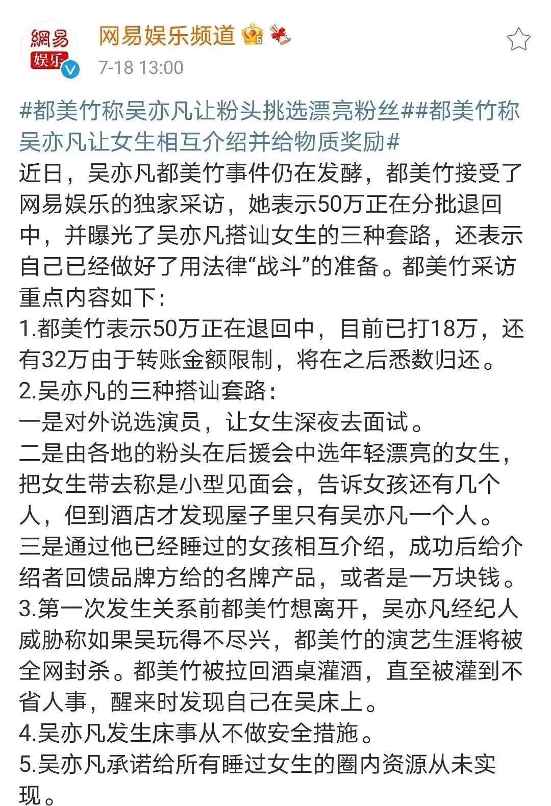 昨晚,都美竹又放了波猛料來錘吳亦凡!