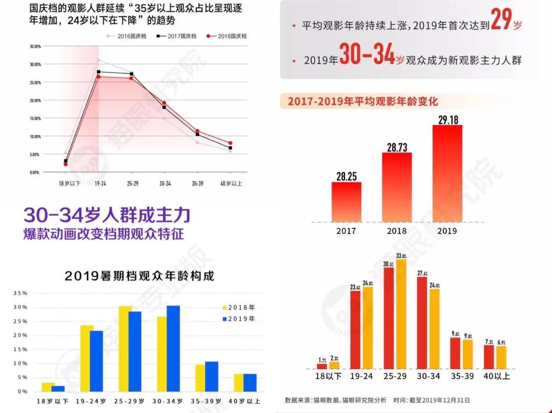 早在2018年,貓眼數據就覆盤了2016年-2018年三年暑期檔觀眾畫像,指出“35歲以上觀眾佔比逐年增加,24歲以下觀眾下降”的趨勢,當時就有不少媒體對年輕人不去電影院提出了擔憂。到了2019年暑期檔,趨勢仍在持續。在疫情來臨前的2019年全年報告裏顯示,平均觀影年齡持續上漲,首次達到29歲,同時,30-34歲觀眾成為新觀影主力人羣。