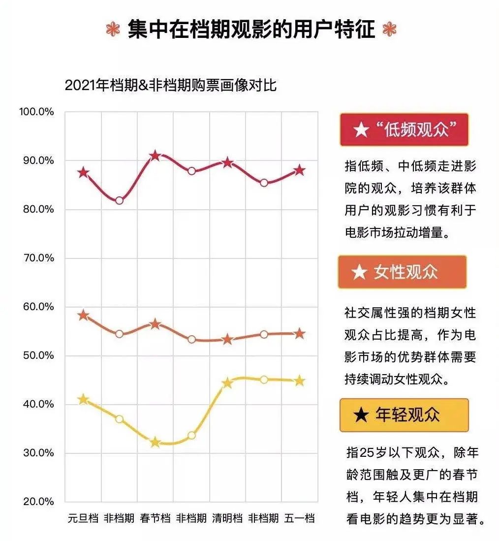 2020年情況特殊,疫情後出現報復式觀影潮,年輕觀眾們曾回到過電影院,復工後最近的檔期即為2020年暑期檔,當時24歲以下觀影人羣佔比由2019年同期的29.5%暴漲至39.4%,但隨後佔比在2020年國慶檔、2021年春節檔再接連下滑,直到2021年五一檔,佔比又明顯回升,不過也是這一次,貓眼研究院解析指出,年輕人集中在檔期看電影的趨勢更為顯著。