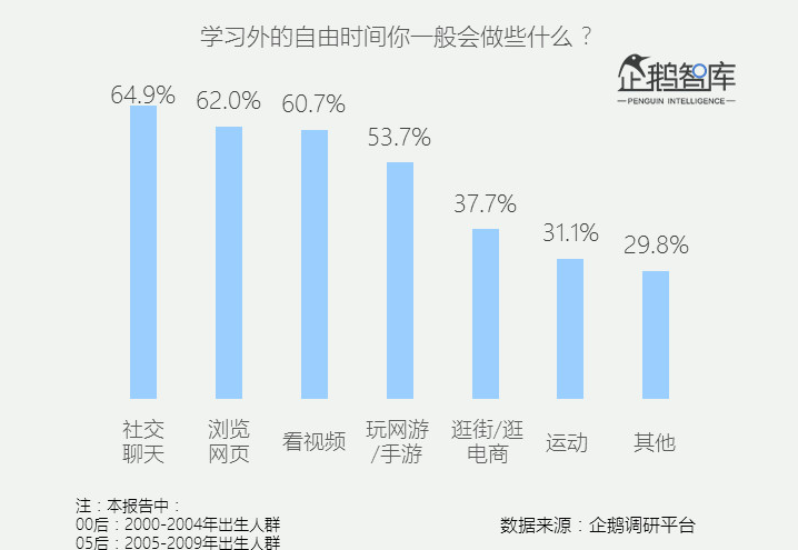 一則不算新的統計,側面反應了電影院在00後心中的位置。2018年企鵝智酷曾針對00後、05後做過一個統計,在被問及“學習外的自由時間你一般會做些什麼?”時,出現的前六個選項分別為,社交聊天、瀏覽網頁、看視頻、玩網遊/手遊,逛街/逛電商、運動,裏面沒有“去電影院”選項,唯一跟電影有關的,是看視頻。