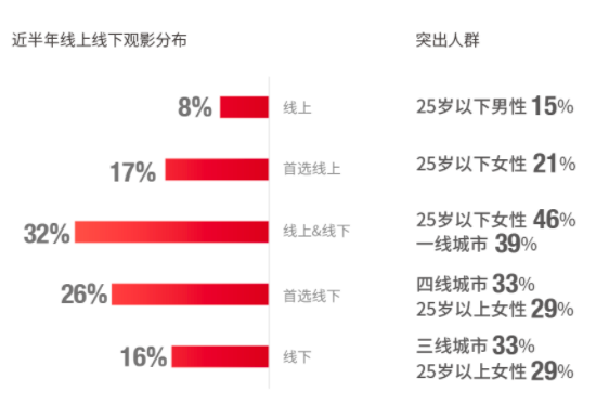在內容的播放渠道上,線上視頻以其便捷性,分走了一部分對大銀幕沒有追求的觀眾。一個可以參考的數據是,2018年、2019年、2020年近三年觀眾平均觀影頻次分別為3.06、2.88、1.73次,頻次明顯下降。貓眼數據對觀影人羣進行分析,儘管首選線上觀影的人羣沒有線下的多,但首選線上的人羣裏,25歲以下年輕觀眾明顯居多數。