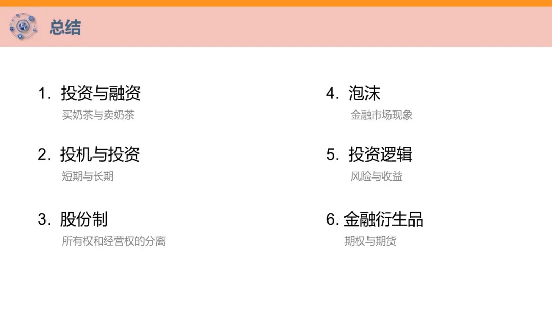 好了!總結一下這次講的內容。我們講了金融的核心問題,就是研究投資和融資這兩個基本需求。然後講了投資和投機的區別。投機是短線,賺的是波動,投資是長線,看重價值。我們分析了股份制的優勢和特點。接着我們研究了一個金融市場的現象,即一個資產的價格遠超其價值的泡沫現象。然後我們介紹了基本的投資邏輯,即風險與收益。最後我們介紹了一些金融衍生品,即期權和期貨。