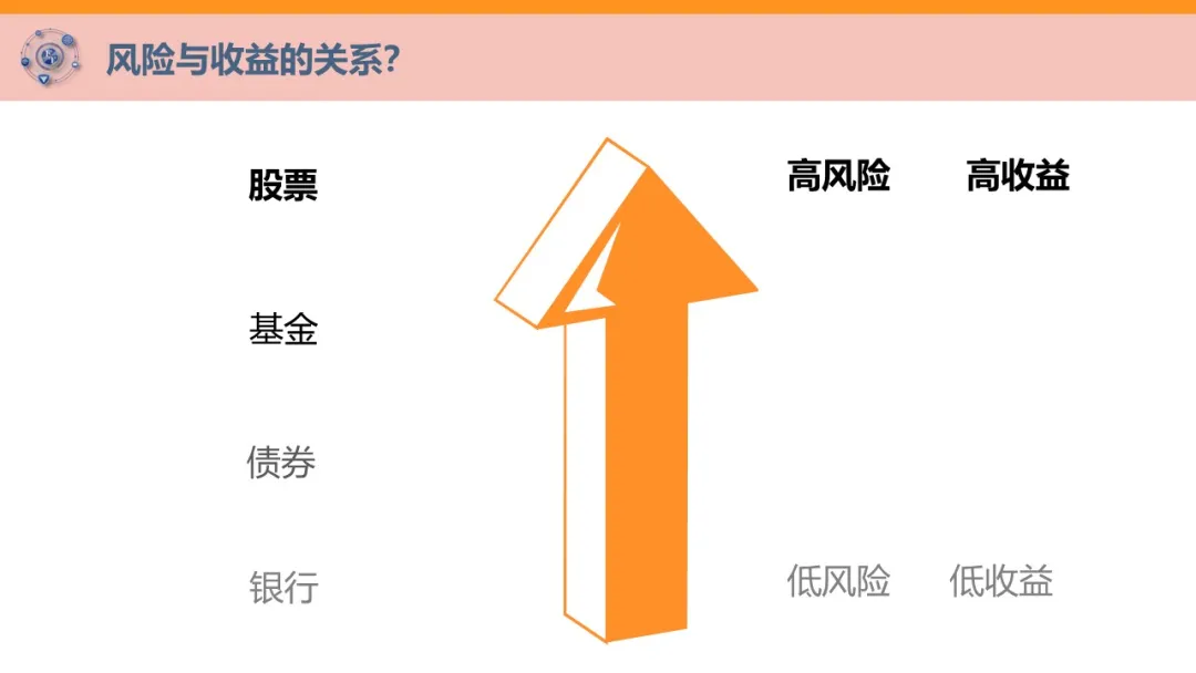 這裏引入了一個投資邏輯的關係。很多時候我們的投資就是在風險和收益之間做平衡。簡單來講,收益越高的投資品,風險越大,收益越低的投資品,風險越小。通常我們常見的投資可以分為銀行,債券,基金和股票。這四者風險依次增加,收益也依次增加。銀行的邏輯大家都清楚,股票也講了。什麼是債券呢?一般就是企業或者政府發債券,相當於向你借錢,然後過一陣子連本加利還給你。企業或者政府破產的可能性非常小,所以也是風險比較小的投資行為。基金可以理解為僱人替你操盤股票和其他金融衍生品,並且要付給這個人工資,簡單講可以説是降低了收益和風險的股票。