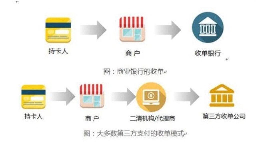 再來説一下銀行通道,商家收到的錢首先會到銀行,再由銀行結算後轉入商家指定的銀行卡賬户,一般簽約哪家銀行通道,就會轉入該銀行卡賬户。