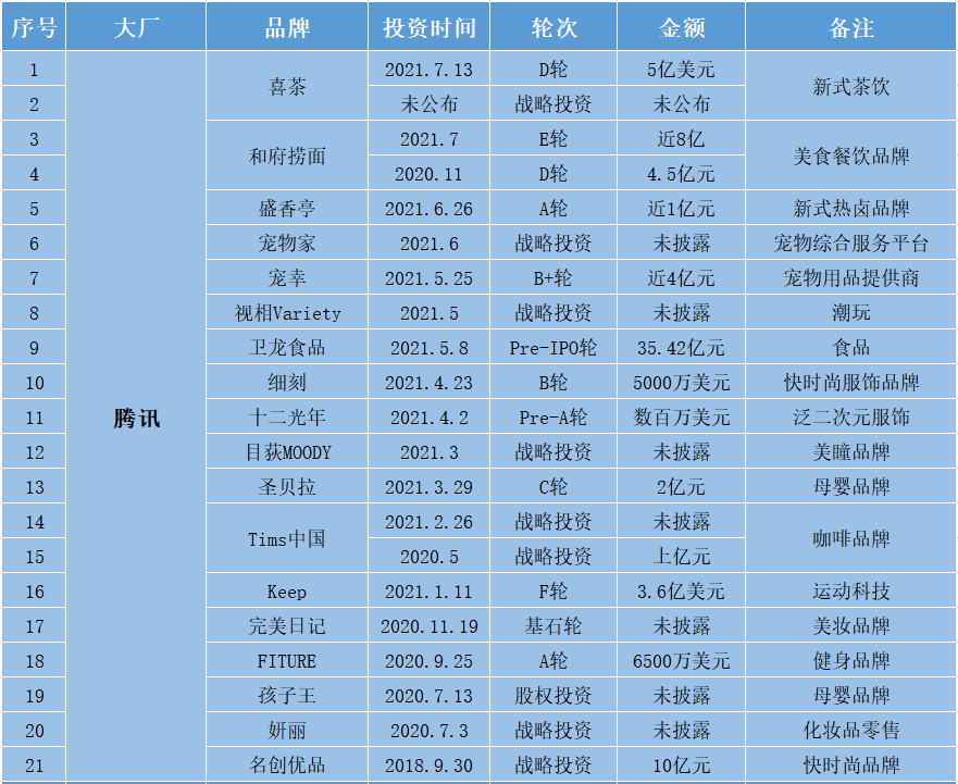 盒飯財經根據天眼查、IT桔子等公開數據不完全統計,騰訊近3年至少累計在新消費領域投資16筆,今年上半年投資13起,已披露的金額累計超過130億人民幣。