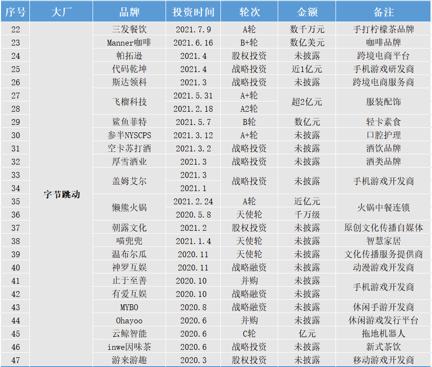 盒飯財經不完全統計,從2020年至今,字節跳動在新消費領域至少投資了23家,其中僅在今年上半年,就投資了15家,是去年一年的2倍。