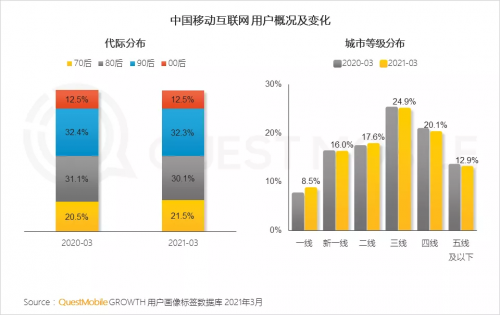 90後已經成為消費的主力羣體。第三方數據機構QuestMobile發佈的《2021中國移動互聯網春季大報告》稱,截止到2021年3月,移動互聯網用户數量11.62億,其中用户結構中,70後、80後、90後、00後佔比分別為21.5%、30.1%、32.3%、12.5%。