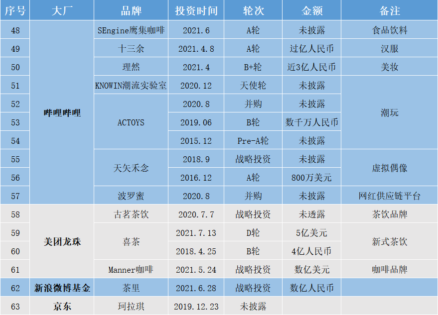僅在今年上半年,據盒飯財經不完全統計,騰訊、字節跳動、嗶哩嗶哩、美團、京東、新浪微博6家互聯網大廠,在新消費領域的投資已經超過35起。
