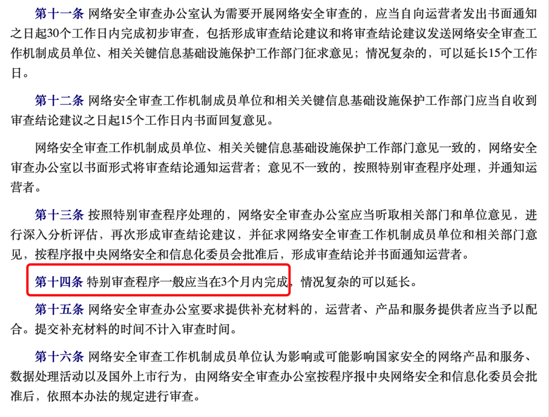 對比前後兩個版本,記者發現,除了前述對掌握超過100萬用户個人信息的運營者赴國外上市的審查外,新版本將《數據安全法》列入法律依據,並將特別審查時間從45個工作日延長至3個月。
