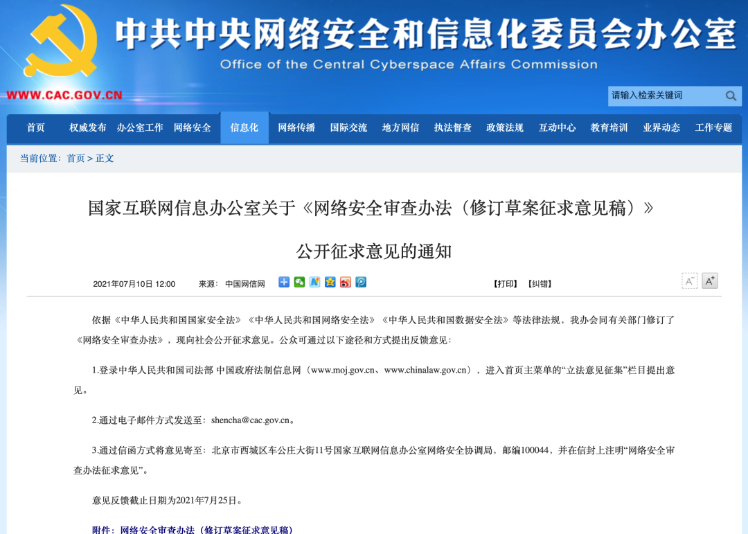 《網絡安全審查辦法(修訂草案徵求意見稿)》,圖源:網信辦