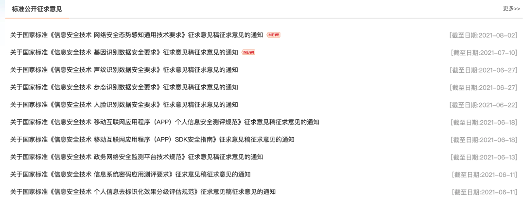 全國信息安全標準化技術委員會官網顯示,目前關於聲紋識別、步態識別、人臉識別等方面的數據安全國標近期已通過徵求意見階段,等待正式發佈。而關於網絡安全態勢感知通用技術要求的國標將在8月2日截止意見徵求。