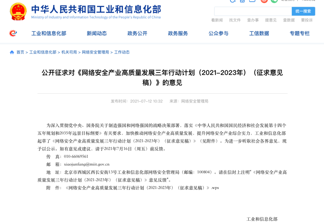也在那一天,工信部發布《網絡安全產業高質量發展三年行動計劃(2021年-2023年)(徵求意見稿)》。文件顯示,要促進網絡安全需求釋放,電信等重點行業網絡安全投入佔信息化投入的比例要達10%,到2023年,網絡安全產業規模超過2500億元,年複合增長率超過15%。