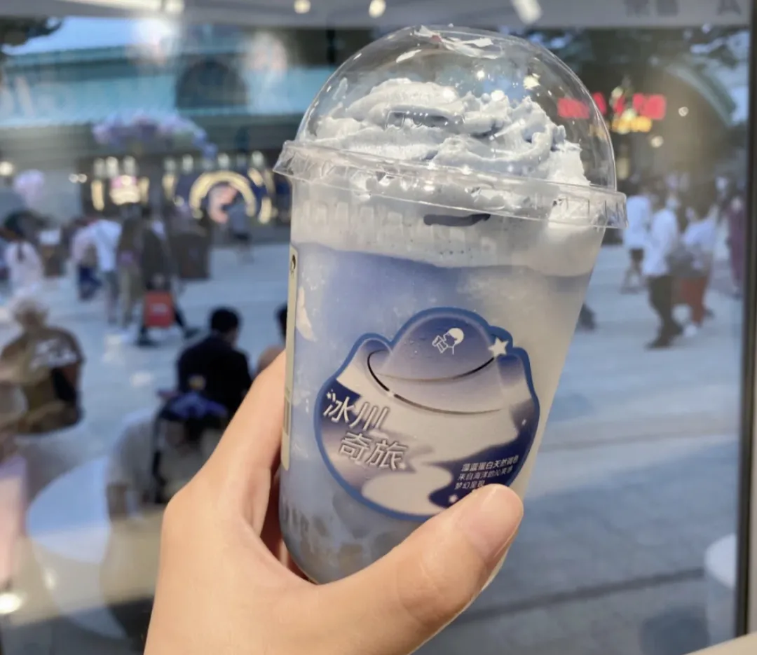 星巴克有“冰雪趣脆星冰樂”,瑞幸有“瓦爾登藍鑽瑞納冰”,喜茶迪士尼限定款“冰川奇旅”;很多飲品店都在推的藍天白雲產品等等。