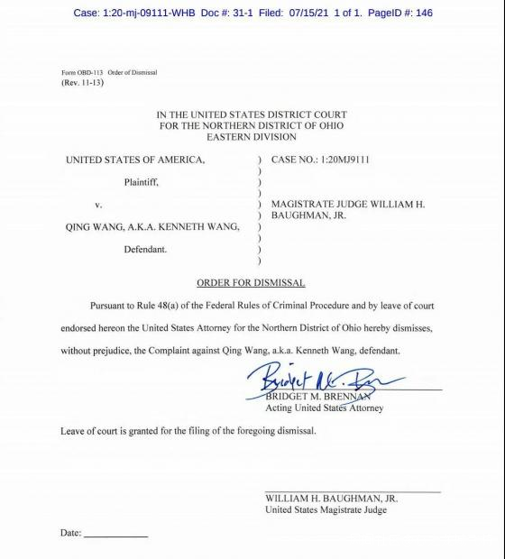 當天,美國聯邦檢察官向俄亥俄州北區聯邦地區法院的治安法官小威廉·H·鮑曼提交了一項動議,表示請求法院下令駁回對王擎的指控。當地媒體要求檢方解釋為何撤銷指控時,後者又發了一份簡短聲明説,這一決定是“在對案件進行審核後”做出的,並拒絕進一步置評。