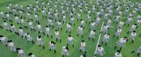 開場女子中學的開學舞,要鎮得住電影的場子,劇組從全國招募了300個高顏值舞者,不算練習,現場拍攝就花費了四五天,遠全中近特,為了拍一個整齊的縱深鏡頭,現場還會拉一條直線,讓大長腿整齊到處女座式的舒適。